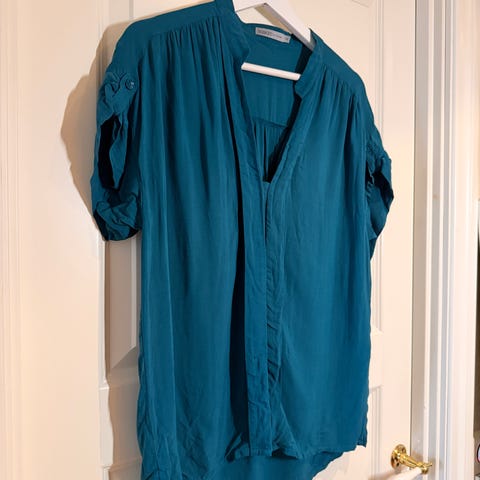 Soaked in Luxury bluse for dame i størrelse XS. Blusen er rød og laget i polyester. Den har lange ermer med mansjett, rund hals og knappelukking foran. Stoffet er lett og delvis transparent med struktur og små prikkedetaljer i samme farge. Lappen på innsiden er klippet bort, da den vistes gjennom stoffet. Romslig str.