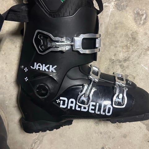 Dalbello Jakk MS alpinstøvler i størrelse 25/25.5 mondo point. (Ca. 39 i vanlig skonummer). Farge svart. Modellen har fire spenner og powerstrap øverst for god tilpasning rundt leggen. Støvlene har justering for flex (soft/hard) på baksiden. Leveres med original eske merket Jakk MS black/black, sålen er merket 298 mm.