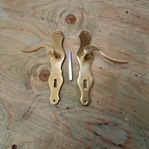 Dørvrider med tilhørende dørskilt i messing. Klassisk utforming med to håndtak og to skilt med nøkkelhull. Passer til innvendige dører der man ønsker et tradisjonelt uttrykk i messing. Egnet for utskifting eller oppgradering av eksisterende dørbeslag.Jeg har til 5 dører .prisen er 800.- for alle 5