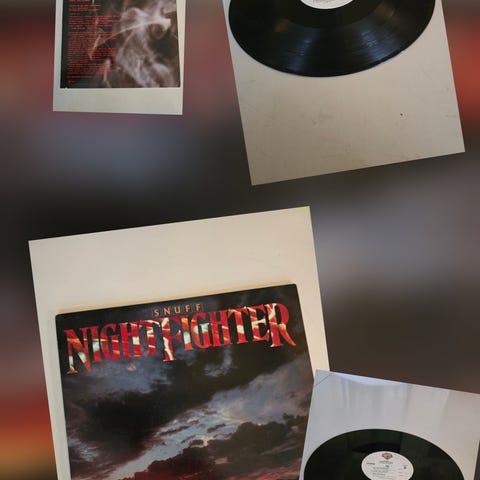 Snuff Nightfighter LP vinylplate. Albumet er utgitt på vinyl i LP-format. Omslaget viser albumtittel og sporinformasjon på baksiden. Egner seg for samlere og for avspilling på platespiller som støtter LP-format.