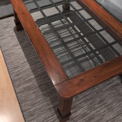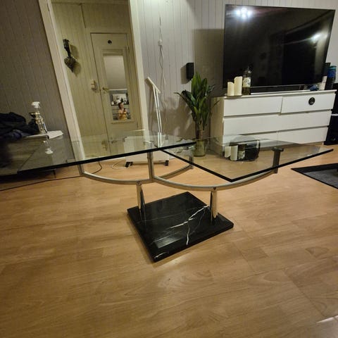 Selger mitt glass salongbord. Det er noen små riper i overflaten.