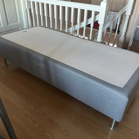 Rammemadrass 90x200 lys grå fra North beds (Møbelringen) med 8 cm overmadrass samt en ekstra 4 cm overmadrass. 23 cm runde ben i stål. Pent brukt, ingen uhell.