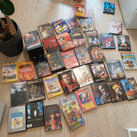 Disney DVD og Blu-ray samling filmer. Inneholder flere Disney-titler i eske, samt diverse enkeltstående filmer i kurver. Formatene er en blanding av DVD og Blu-ray. Egner seg for deg som ønsker en samlet pakke med ulike Disney-filmer og andre titler. Rundt 100 forskjellige DVD filmer