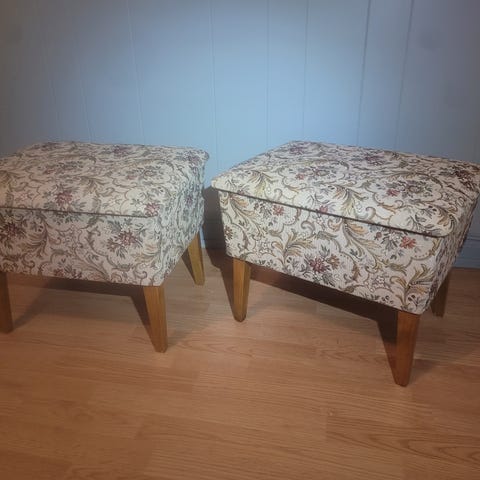 2 stk flotte puffer / krakker med oppbevaring. Solide puffer i heltre. Lette å trekke om med nytt stoff på lokket om ønskelig Selges samlet for 300kr