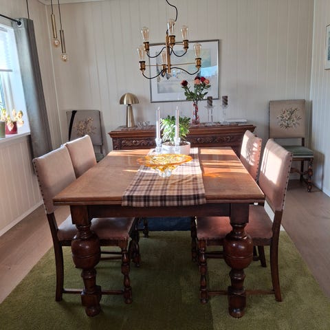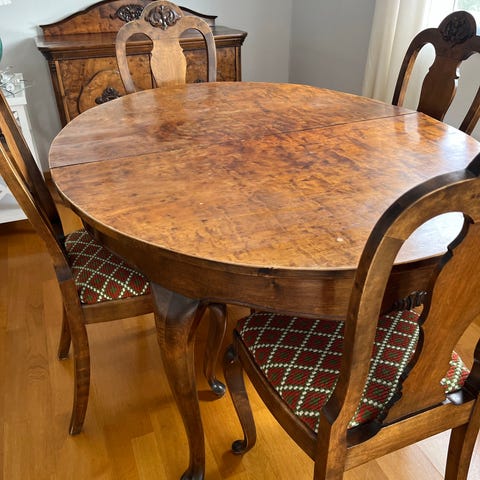 Spisestue i flammebjørk fra 50-tallet selges. Består av bord med to ileggsplater, 6 stoler og et skap. Bordet er 130 x 87 cm ( 76 cm høyt) Platene er 42 cm, så bordet kan utvides til en lengde på totalt 216 cm. Skapet er 150 cm høyt, 120 cm bredt, 44 cm dypt.
