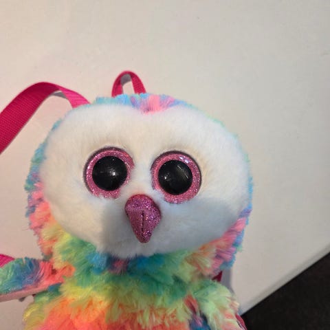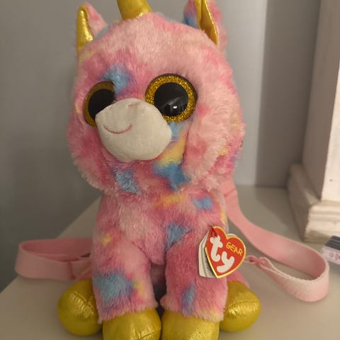 Ty sekk med plysjfigur formet som en enhjørning i rosa og gull. Sekken har paljetter på utsiden og store karakteristiske øyne på figuren. Innvendig har sekken et rom med glidelåsåpning og fôr med hjerteprint. Passer til barn som vil ha en liten ryggsekk kombinert med kosedyrfigur.