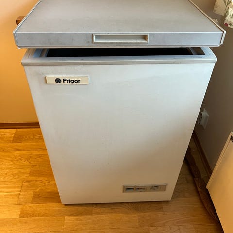 Fryseren har stått i garasjen lenge, så den er ripet opp, spesielt på venstre side og toppen.