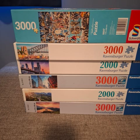 4 stk 1000 brikker (3 komplett ,men på trollpuslespillet er det en brikke som er feilprodusert. Er et pittelite hull på det ferdig puslet.)100 kr stk.1 stk 1500 brikker.(en brikke mangler) 80 kr