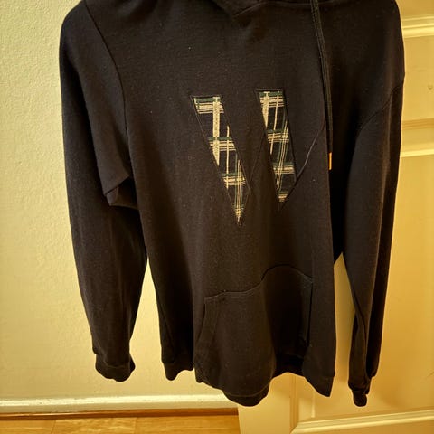 WoolLand hettegenser i ull i størrelse 146/152. Genseren er mørk blå og har hette med snøring og rutete fôr i hetta, samt kengurulomme foran. Kr 200,-