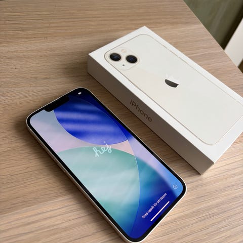Apple iPhone 13 smarttelefon med 128 GB lagringsplass i hvit farge.