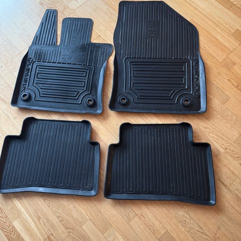 Gummimatter til salgs, tror de er fra Gytis. Ble levert sammen med vår brukte 2019 modell 7-seter Tesla Model X (Raven, sept 2019 produksjon) kjøpt av oss i 2021, og vært pakket ned siden. Aldri brukt av oss, og fremstår lite brukt av forrige eier.