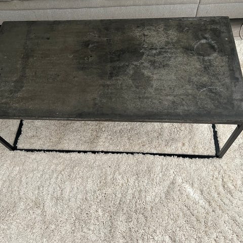 Understellet er åpent, noe som gir god plass til oppbevaring under bordet. Overflaten på bordplaten har noen bruksmerker og mindre riper, som vises på bildene.