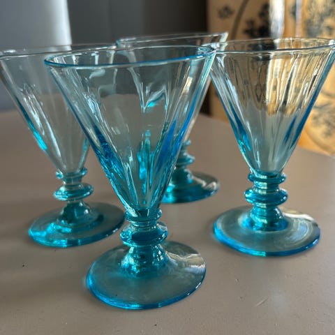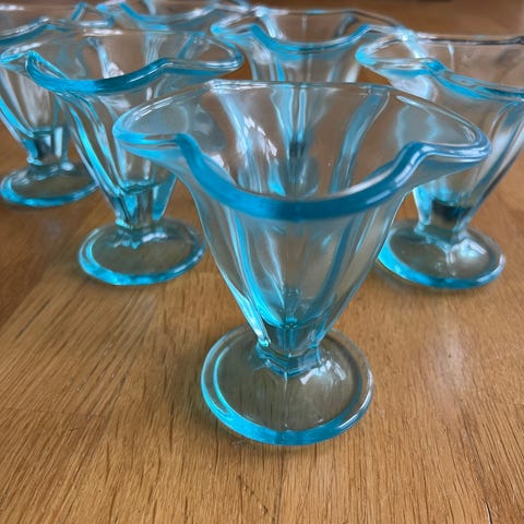 IKEA glasskåler på stett i blått glass. Kålene har rund form med lav, vid skål og tydelig stettfot. Laget i gjennomfarget glass med lys blå tone. Egnet til servering av dessert, is eller småretter ved borddekking.