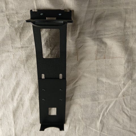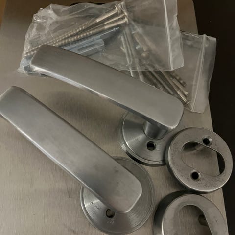 Kraftig veggfeste i metall med rund bunnplate og buet feste. Inkluderer tilhørende skruer og plugger for montering. Der er tre av de store krokene, den siste kom ikke med på bildet. Målebånd på bildene viser omtrentlige mål på festene. Tre mindre «kroker», se feste i bilder.Skriver de er synlig brukt pga malingrester som må fjernes.