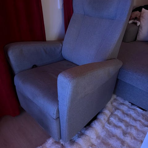 Pent brukt stol fra Ikea selges 600 kr. Ny pris er over 2000 kr. Høyden er sittehøyde. Avtagbart trekk. Pute med borrelås. Farge er grå/gråblå. Tre er eik. Hentes i Kroken.