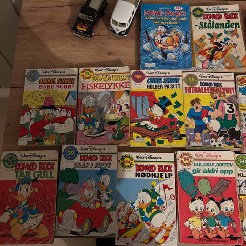 Selger 2 stk Walt Disney Donald Duck tegneseriebøker med nummer og titlene nr 8 «Donald klarer brasene» og nr 3 «Donald i knipe».
