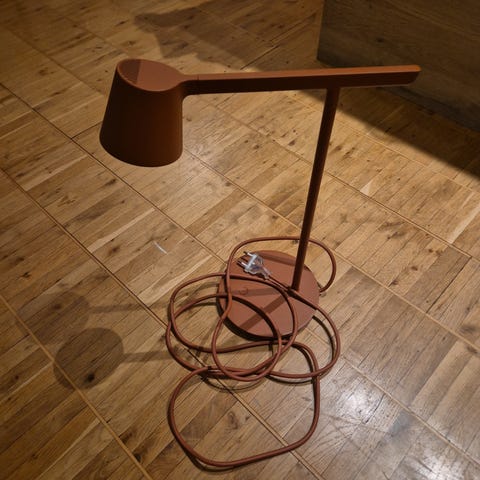 Leaf lamp fra Muuto, designet av Broberg & Ridderstråle. Lys rosa. Alt fungerer som det skal. Bittelite, nesten mikroskopisk merke på foten. Synes knapt, men har tatt nærbilde for å vise.