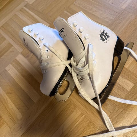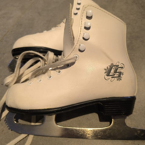Kunstløpsskøyter i hvit farge i størrelse 36 for barn. Klassisk modell med høy ankelstøtte og snøring foran. Skøytene har tagger foran på stålet, som er typisk for kunstskøyter. Yttermaterialet fremstår som glatt og lett å tørke av. Egnet til bruk på isbaner og skøytebaner for generell skøyting og enkel kunstløpstrening for barn i skostørrelse 36.