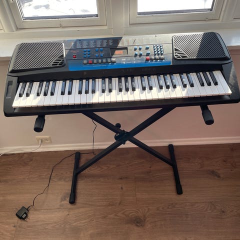 Pianoet står på medfølgende stativ i matchende farge. På bildene følger det også med en enkel, høydejusterbar krakk med polstret sete i sort kunstskinn.