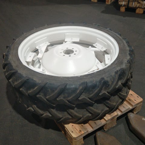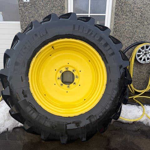 Strøkent hjulsett med justerbare felger som sitter på en John Deere 6110R. Nye dekk foran og 50% slitt bak. Nav bakhjul er med boltsirkel 203mm og navhullsdiameter 152 mm. Nav forhjul er med boltsirkel 275 mm og navhullsdiameter på 221 mm.