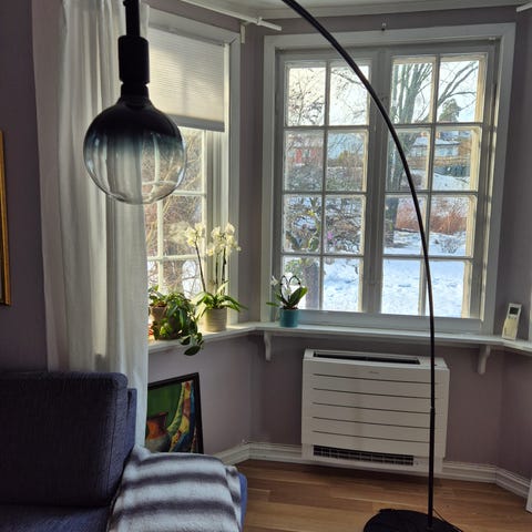 Elegant buelampe / gulvlampe i krom - kalt “arc floor lamp”.