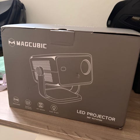 Projektoren er en kompakt modell egnet for visning av film, serier og annet innhold. Den leveres i bordmodell-design med integrerte høyttalere i front. Enheten har strømknapp på siden og står på en stabil base som gir støtte ved plassering på bord eller hylle.