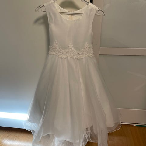 Brudepikekjole kjøpt brukt. Brukt 2 ganger. Selges billig. Komt et hull i ene laget på tyllet. Se bilde. Går sikkert an og fikses på en eller annen måte. Synest ikke sånn kjempe godt. Kjøpt på brudesalong.
