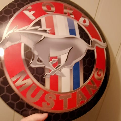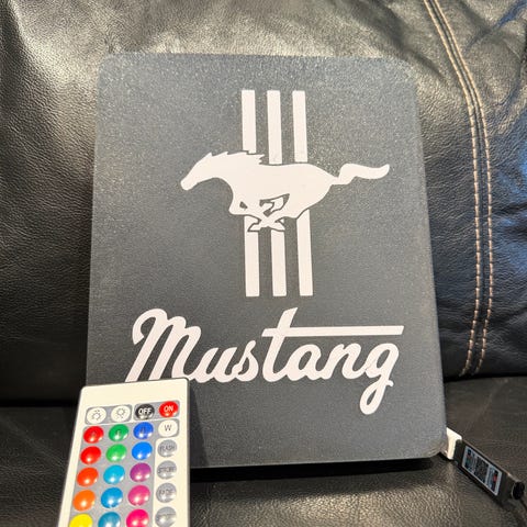 Mustang LED lysskilt med fjernkontroll og flerfarget lys. LED-belysningen kan endre farge, blant annet grønn, blå og rød, og styres via medfølgende fjernkontroll med flere farge- og lysinnstillinger. Egnet som dekorlys i garasje, verksted, kontor eller hjemme. Skiltet har rektangulær form og kan plasseres på hylle eller lignende under bruk.