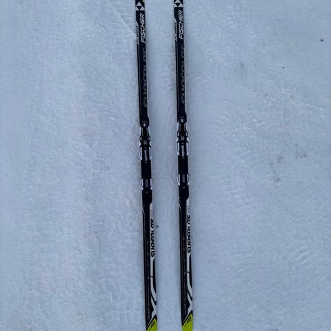 Fischer langrennski med Rottefella bindinger i gul og svart farge. Skiene er klassiske langrennski egnet for preparerte løyper. Rottefella-bindingene er montert på skiene og passer til kompatible langrennsstøvler. Settet på bildene viser flere par ski og staver, som kan være aktuelle for både barn og voksne avhengig av lengde og høyde. Skiene har såle tilpasset vanlig klassisk langrenn og er egnet til turbruk på snødekte løyper.