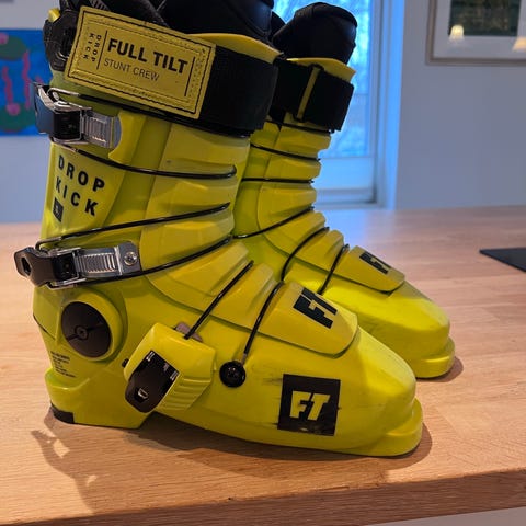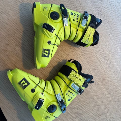 Full Tilt Drop Kick alpinstøvler i gul farge med svarte detaljer. Modellen har tredelt skallkonstruksjon med flere justerbare spenner og powerstrap øverst for bedre tilpasning rundt leggen. Innerstøvlene er polstrede og designet for komfort og støtte. Støvlene egner seg til alpint/frikjøring og ikke minst er knall i park / til jibbing.
