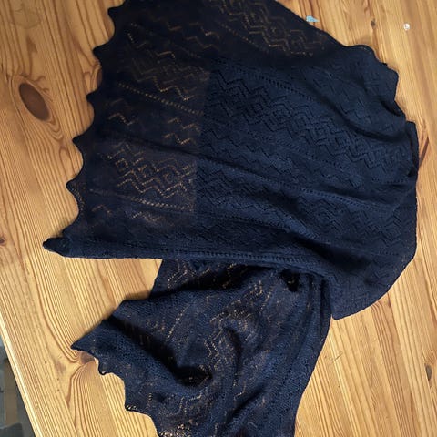 Flott sort hjemmestrikket bunadssjal/festsjal i Rauma lamullgarn. Med frynser. Strikket av min mor. Mønster og garn kjøpt fra Husfliden. Passer alle typer bunader. Selges kun til oppgitt pris. Sjalet er en mindre utgave og vil passe best barn/ungdom mht til å kunne knyttes rundt kroppen. Se bilder for mål (lengde på bakstykke + lengde på hver ‘vinge’)