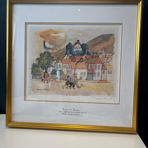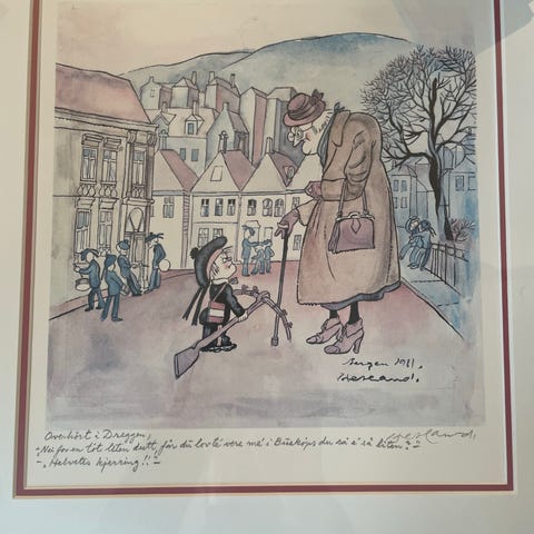 Hetland-trykk med humoristiske Bergensmotiv. Selges samlet kr 1500 eller bud.