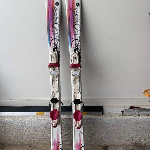 Völkl Chica alpinski med integrerte bindinger. Skiene har hvit basefarge med flerfarget grafikk i rosa og blå toner. Undersiden er sort. Modellen er en barne-/juniororientert alpinski egnet til bruk i preparerte bakker. Bindingene er montert på skinnen og har justerbar lengde (DIN- og størrelsesinformasjon står på bindingene). Skiene passer for vanlig alpinbruk i skianlegg.