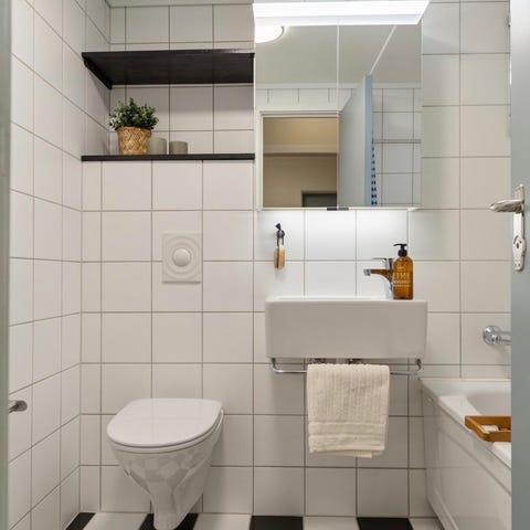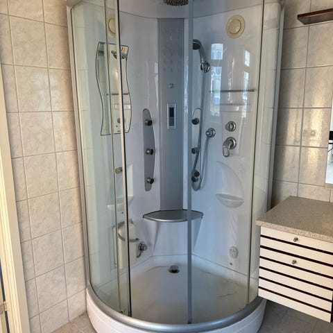 Baderomspakke består av dusjkabinett, servantskap med servant og blandebatteri, samt frittstående toalett.