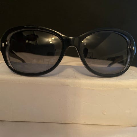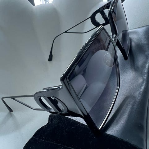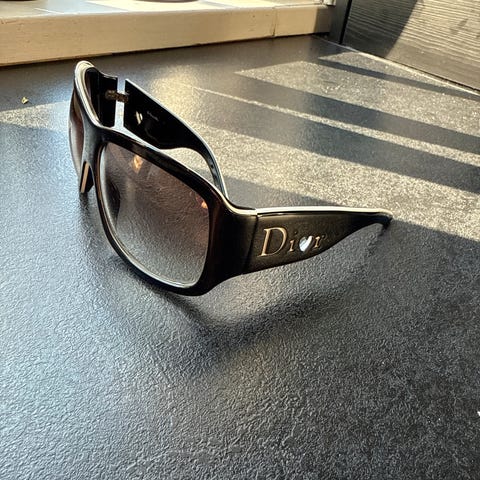 Dior solbriller for dame i svart innfatning med mørke glass. Modellen har hel ramme foran og tynne metallstenger på sidene. Leveres med originaltui fra Dior, som vist på bildene. Egnet som solbriller til hverdagsbruk.