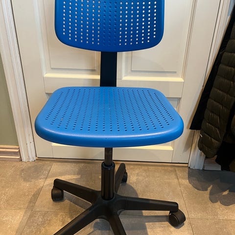IKEA barnestol av typen kontorstol med sete og rygg i blå plast med perforert mønster. Stolen har sort understell med hjul og dreiefot. Egnet som arbeidsstol til barnerom eller skrivepult. Justerbar høyde.