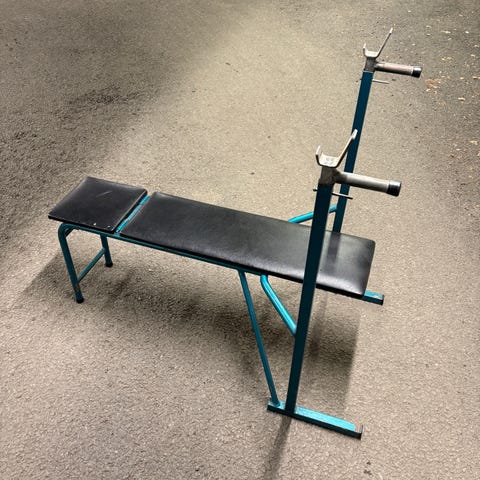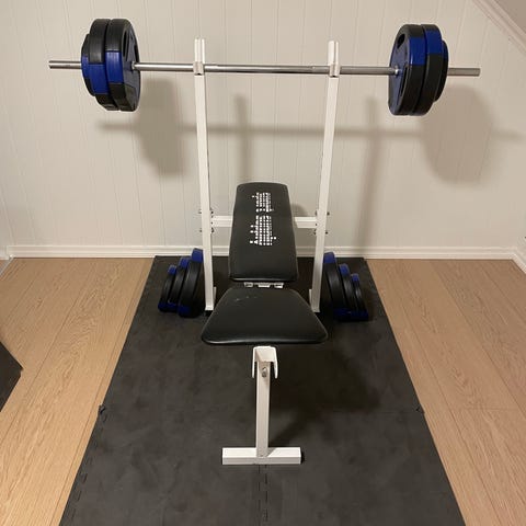 Vektbenk med vektstang og flere vektskiver. Benken har polstret liggeflate og justerbar rygg for ulike øvelser. Stativet har holdere for vektstang, og det følger med vektskiver i ulike størrelser som kan brukes til styrketrening av overkropp, som benkpress og andre pressøvelser. Egner seg til hjemmetrening i treningsrom eller garasje. 17,5kg med vekter