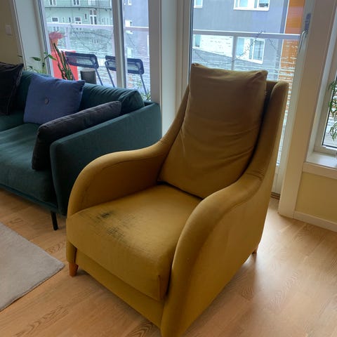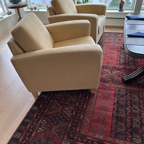 To stykk ca 100 år gamle stoler selges samlet. Stolene har vært trukket om og fjæret opp. Totalt to stoler som selges samlet. Den ene stolen har noen bruksmerker og en flekk, ellers pent brukt. Må hentes på Sandaker i Oslo. 5 etasje med heis.