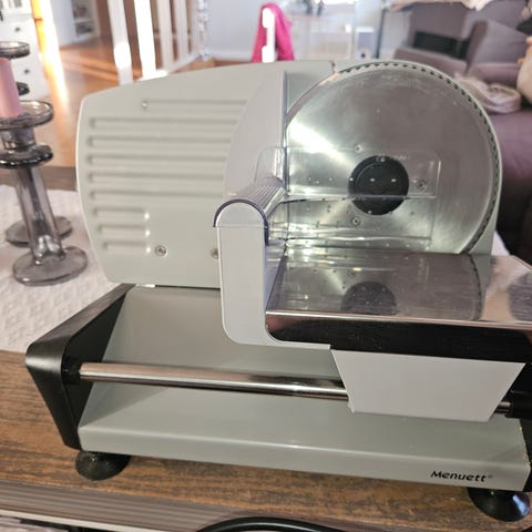 Ostba. kjøtt- og påleggsmaskin i bordmodell med justerbar skivetykkelse. Maskinen har rund kniv og slede for trygg og jevn skjæring av kjøtt, pålegg, ost og lignende matvarer. Egner seg til bruk på kjøkkenbenk eller arbeidsbord. Strømledning tilkobles vanlig stikkontakt. Maskinen har gummiføtter for stabil plassering under bruk.