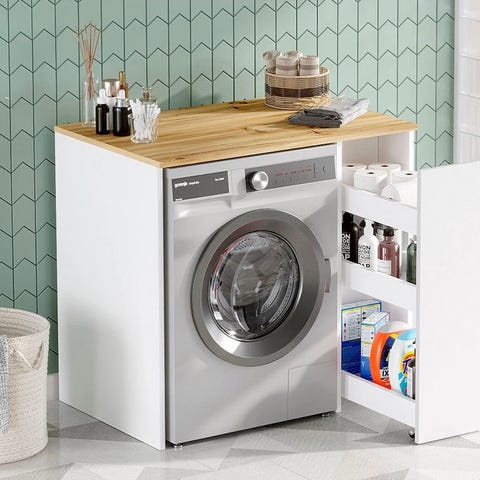 IKEA hylle over vaskemaskin i svart metall. Hyllen er laget for å plasseres over en vaskemaskin eller tørketrommel for å utnytte plassen i vaskerom eller bad. Den har en åpen ramme med en hylleplate til oppbevaring av vaskemidler, kurver eller annet tilbehør. Passer til standard frontmatede vaskemaskiner.