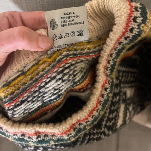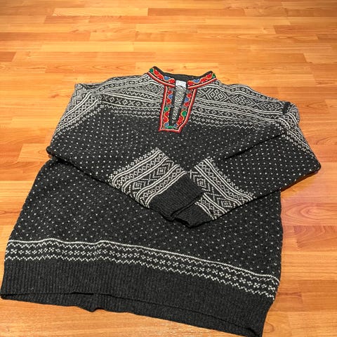 Dale of Norway ullgenser for herre i størrelse L. Genseren er grå med tradisjonelt mønster i kontrastfarger. Den har høy hals med glidelås og er strikket i ull, som gir god varme. Passer til hverdagsbruk og utendørsaktiviteter i kjølige temperaturer.