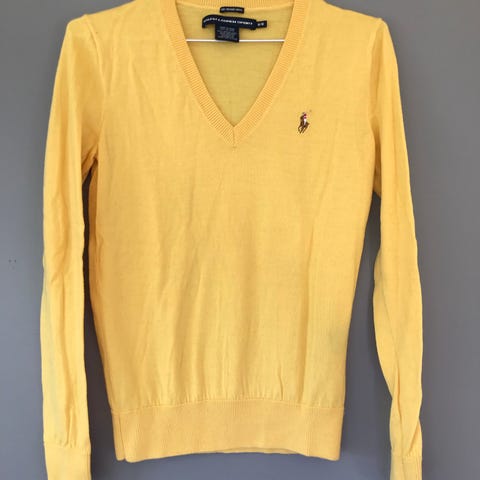Ralph Lauren Sport genser for dame i størrelse M. Genseren er laget av ull og har V-hals og lange ermer. Fargen er gul, med liten logo på brystet. Passer til hverdagsbruk eller som et lag over skjorte eller topp. Materiale: ull (merino wool ifølge innvendig merkelapp).