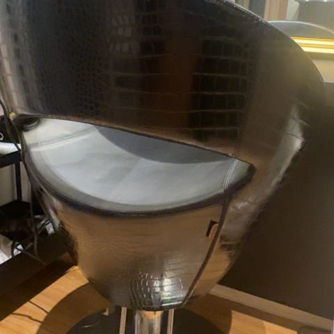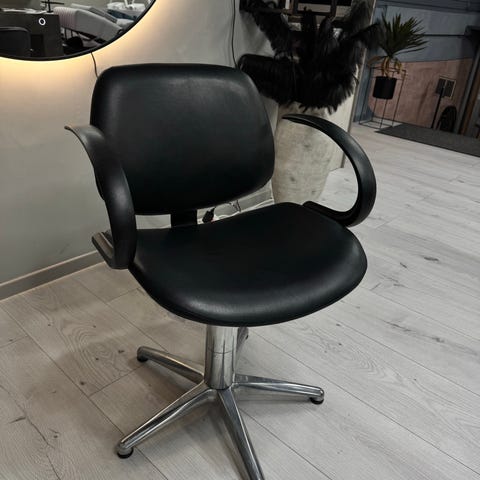 Frisørstolstol i svart kunstskinn med vakkert mønster. Stolen har polstret sete og rygg, metallarmelener og fot med rund sokkel i metall. Egner seg som sittemøbel i for eksempel frisørsalong, arbeidsrom eller andre innemiljøer der det er behov for en robust stol med lettstelt overflate. Høyden på stolen kan justeres. Tung og robust, så den er veldig god og solid! :)