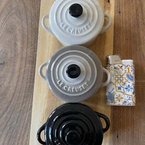 Smeg cocottes mini-gryter i kremfarget keramikk. Settet består av små gryter med lokk og håndtak på sidene, egnet til servering av porsjonsretter, tilbehør eller desserter. Keramikkmaterialet gjør dem egnet til bruk i ovn og på bordet til servering. Gave så aldrig brukt.