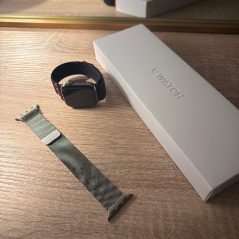 Apple Watch Series 11, 46mm, titanium, GPS+LTE med Milanese loop.