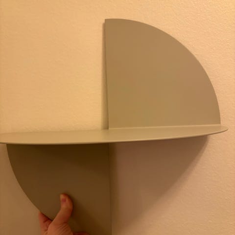 Jysk vegghylle i halvsirkel-form i grått metall. Hyllen monteres på vegg med oppheng på baksiden.