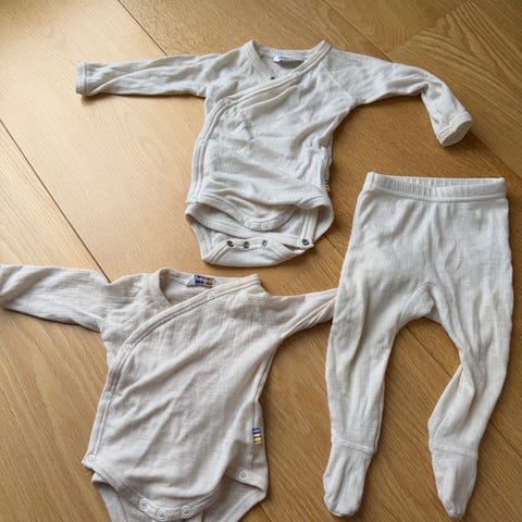 Klespakke med 2 bodyer og to bukser, alt er i størrelse 56. Babyen vår vokste raskt ut av klærne, så de er pent brukt. Ingen flekker eller skader.