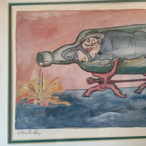 Audun Hetland (1920-1998) Bergensk tegner, grafiker og maler. Kunstneren er kjent for sin utpregede sans for mennesketyper og frodige karikaturer.