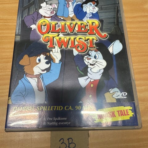 Oliver Twist DVD tegnefilm med norsk tale. Utgaven inneholder flere episoder basert på historien om Oliver Twist, presentert som animasjonsserie med dyrefigurer. Dobbel spilletid på omtrent 90 minutter. Tekst og lyd er tilpasset norsk publikum.