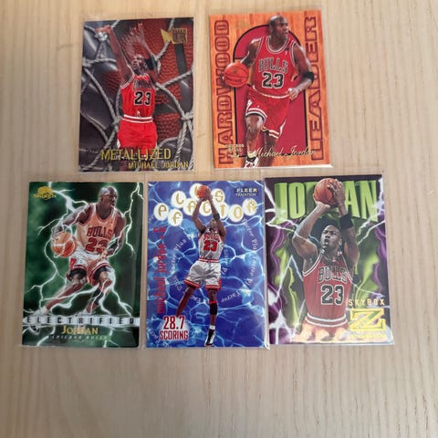 Samling med basketball samlekort med motiv av spilleren Michael Jordan. Kortene viser ulike kampsituasjoner og portretter fra forskjellige serier og utgivelser. Egnet for samlere av basketball- og sportsrelaterte kort. Antall, årganger og produsenter fremgår av bildene og kan gjennomgås nærmere ved behov.